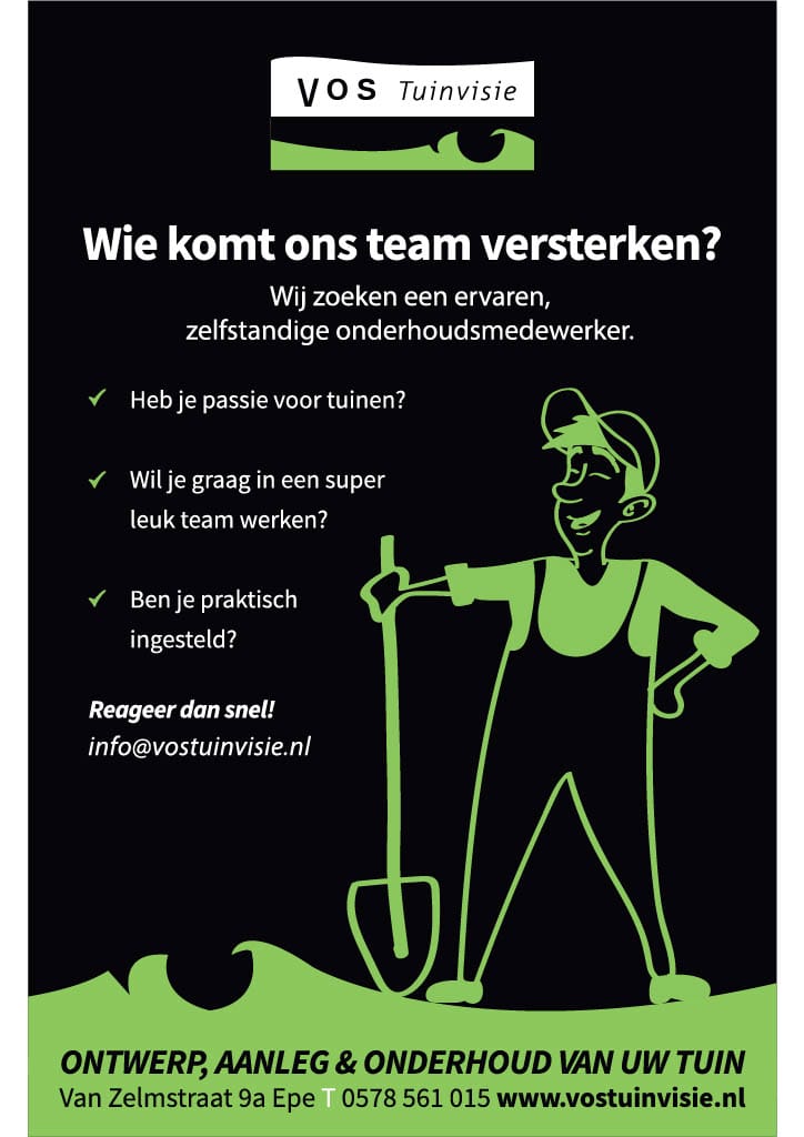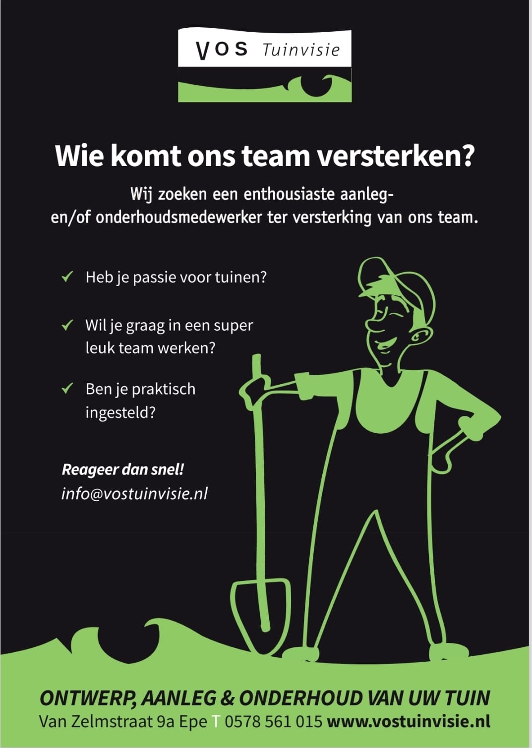 Voor meer informatie over vacatures bij Vos Tuinvisie kun je een email sturen naar [email protected] of ons bellen op: 0578-561015.